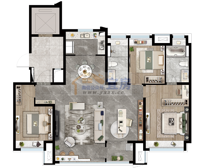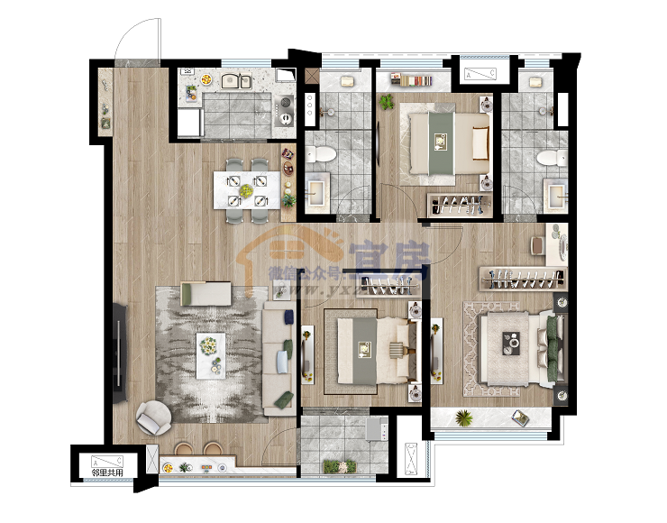 首先,我们拿建面约102㎡的三室两厅一卫来看,约102㎡就可以做到三个房间,约3.7米横厅,一体式餐客厅,U型厨房,南北全飘窗,阳台X+空间。