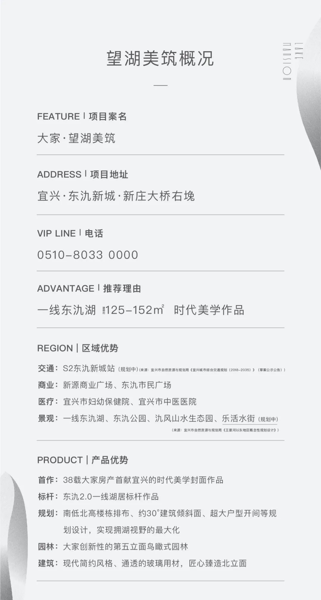 免责声明:本宣传资料为要约邀请,相关内容不排除因政府相关规划、规定及开发商未能知晓的原因而发生变化,本公司保留对宣传资料修改的权利,敬请留意最新资料。本项目推广名为:大家·望湖美筑,核准地名为“望湖美筑东区”“望湖美筑西区”。本宣传资料发布日期为2020年12月,敬请留意最新资料。开发商:宜兴鼎顺置业有限公司/宜兴鼎祥置业有限公司。预售证:宜售许字(2020)第071号、宜售许字(2020) 第072号