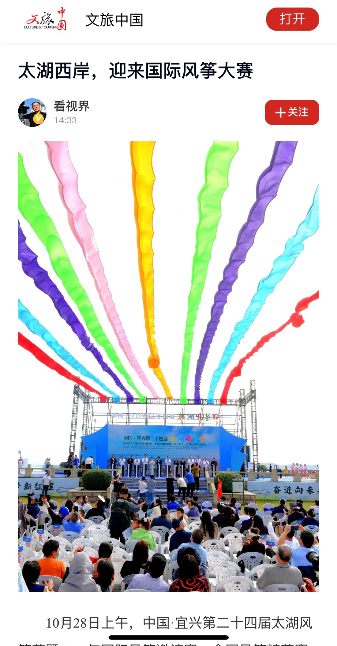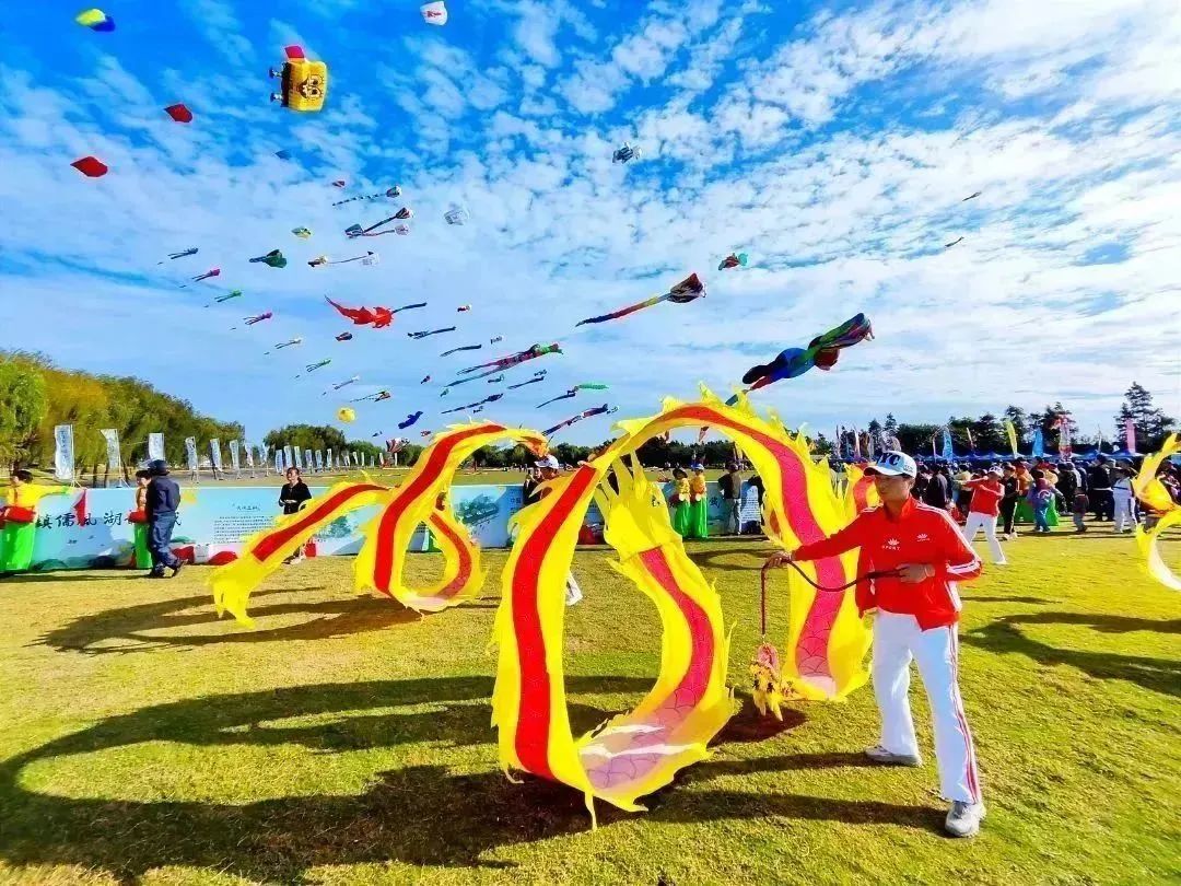 10月28日上午,中国·宜兴第二十四届太湖风筝节暨2023年国际风筝邀请赛、全国风筝精英赛(宜兴站)、江苏省风筝公开赛在江苏省太湖风筝基地——周铁镇竺山湖湿地公园盛大开幕。
