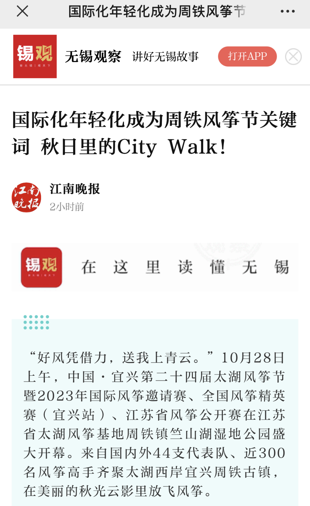 本届风筝节以引发年轻群体共鸣角度为出发点,还推出了“秋日里的City Walk”——中国历史文化街区周铁老街和大有秋一期·竺山两条城镇漫游路线,文艺范和现代感十足,深受年轻人喜爱,满足了当下年轻人对轻旅游、沉浸体验、展示自我、现场观赏的需求。