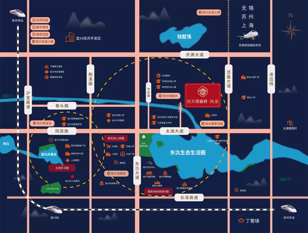 在东氿从来不缺少好的建筑,但繁华与静谧相融合的水系住区却少之又少。宜兴恒大珺睿府·氿玺择址东氿畔,享有三湖一园丰富自然资源;更倚靠东氿公园,绿植丰茂,藏风纳水,清新怡人。作为宜兴城市未来中央,宜兴恒大珺睿府·氿玺难得集聚自然与繁华一身,为宜兴人带来梦想的美好日常。
